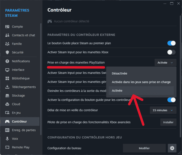 4. Déroulez l’onglet prise en charge des manettes PlayStation et cliquez sur activée.